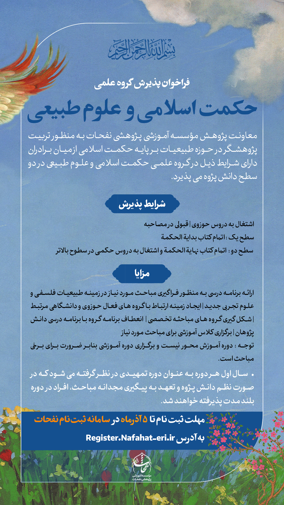 با توجه به دغدغههای موجود و اهداف مؤسسه، گروه علمی «حکمت اسلامی و علوم طبیعی» در سال ۱۴۰۱ فعّالیت خود را آغاز کرد و تعدادی از طلاب علاقمند مشغول به فعالیت در این عرصه شدند. امسال نیز این مؤسسه برای دومین سال پیاپی در نظر دارد از میان طلاب علاقمند و مستعدّ، افرادی را جذب نماید.